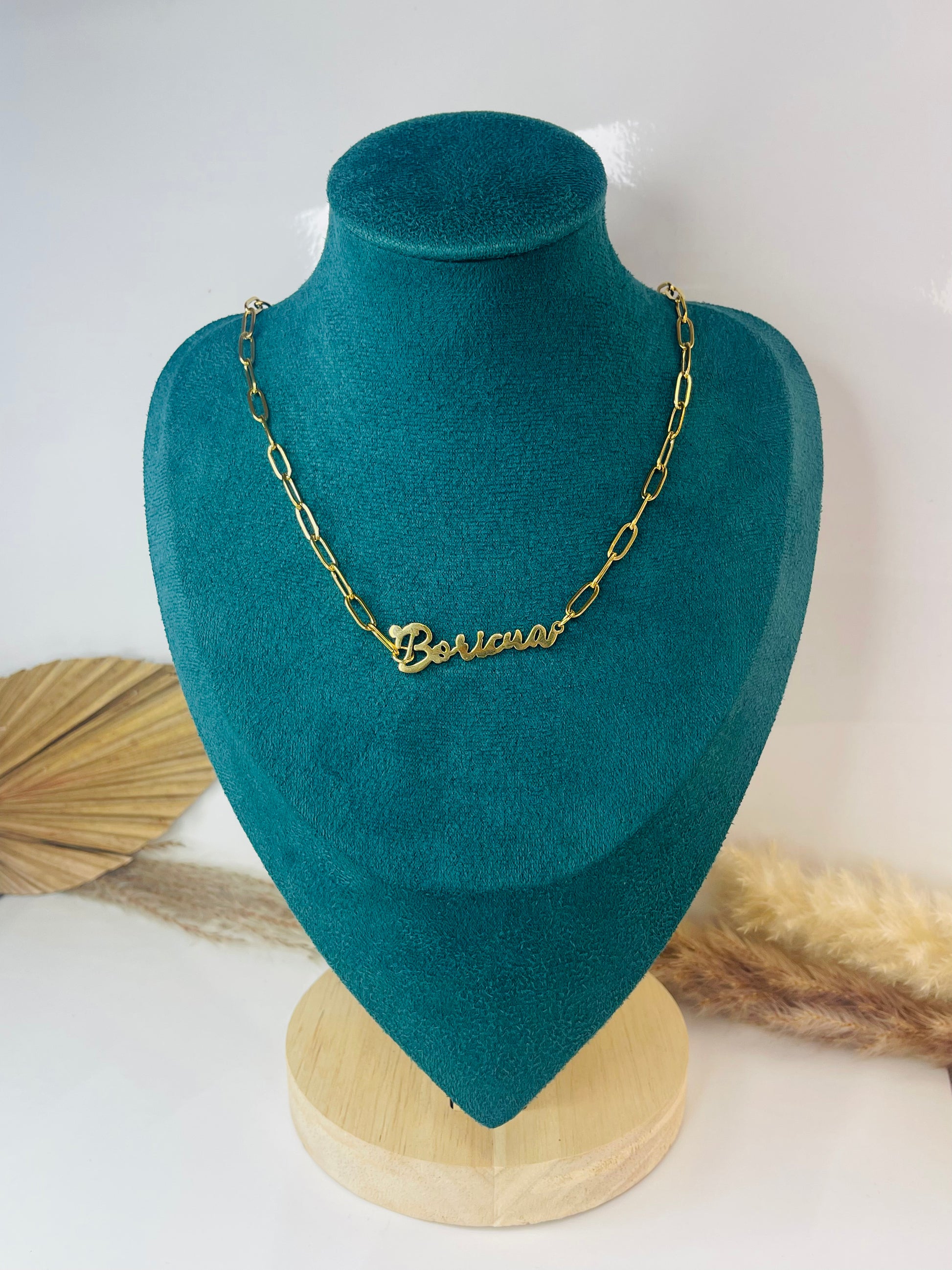 Diseñada para representar nuestra frase favorita “boricua”. Está fabricada en stainless steel, su medida es 16". Está disponible en dorada y plateada, estilos de cadenas distintas por color.