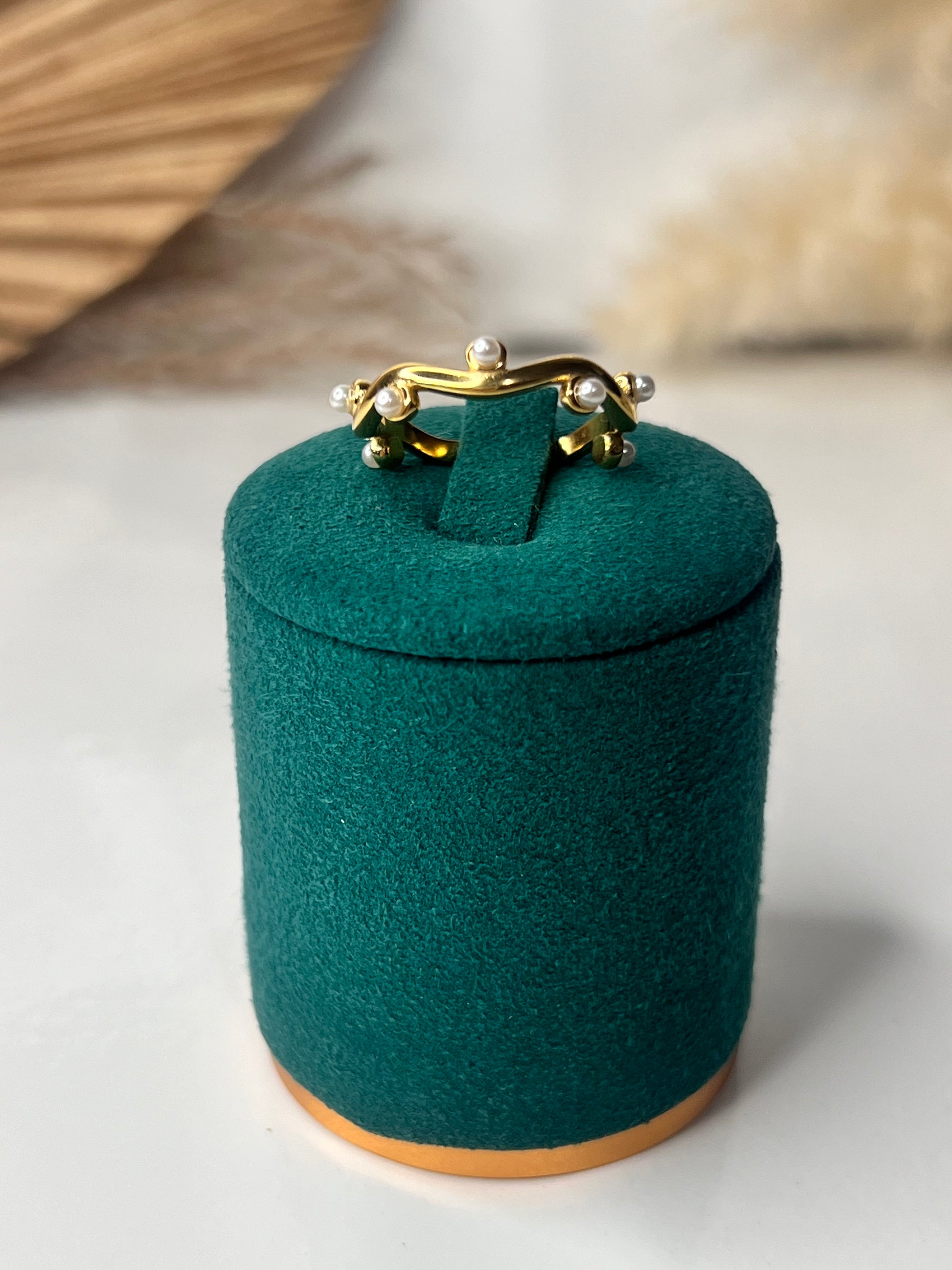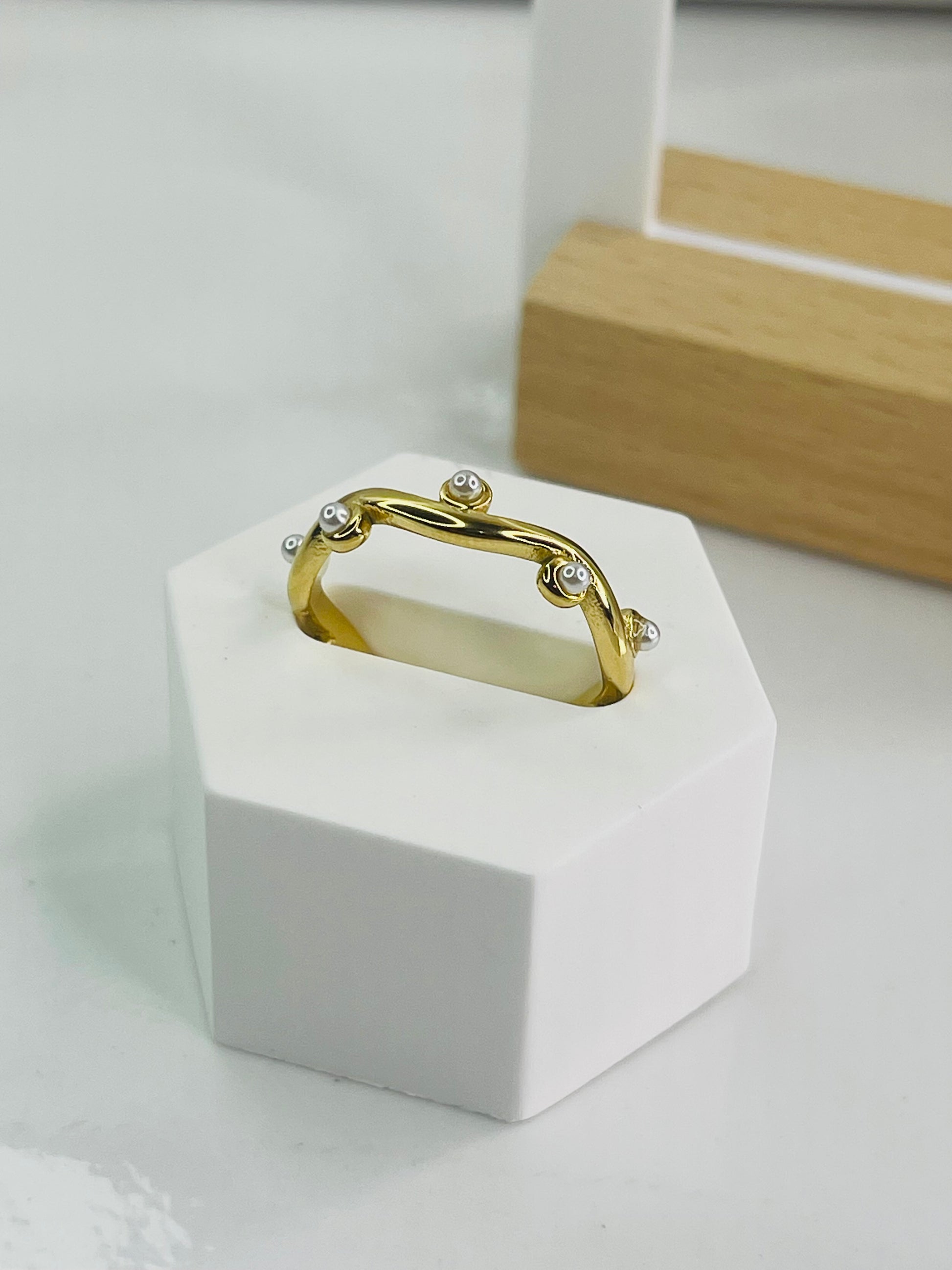 Este hermoso anillo te hará lucir con elegancia, está fabricado en stainless steel, es una pieza ajustable con sus detalles en perlas y diamantes. Estoy segura que te encantará.